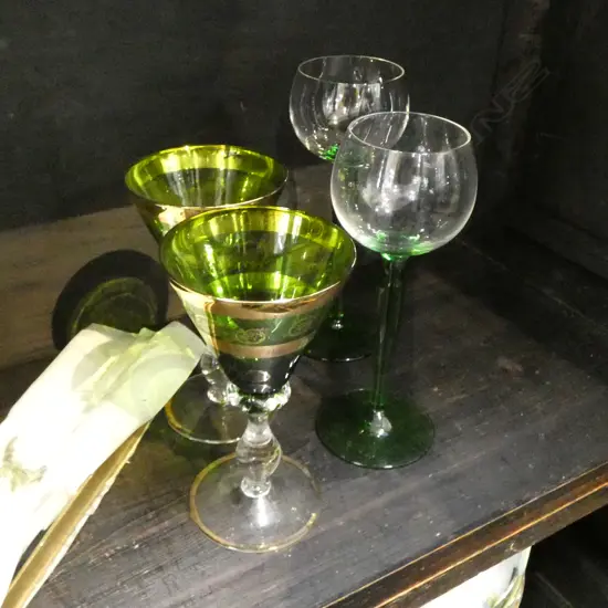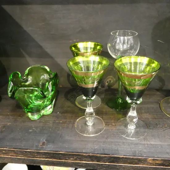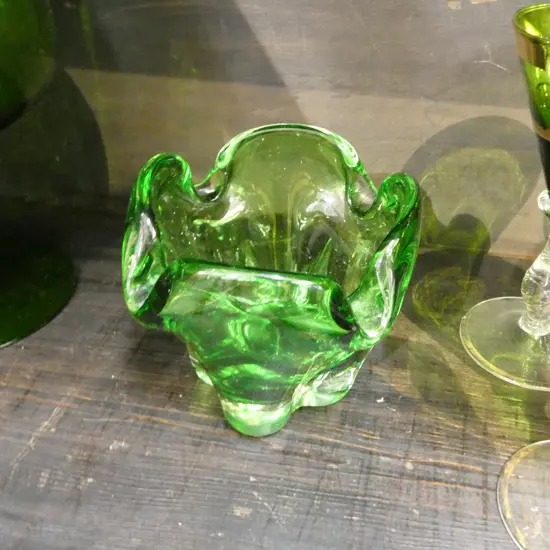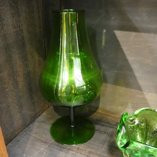 11 PCES GREEN GLASS; DECANTER H.520mm & 9 GLASSES + VASE