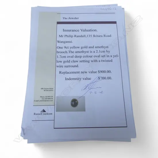 9CT GOLD AND AMETHYST BROOCH with valuation, repairs