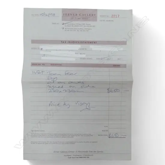 JOAN FEAR, EGG, OIL ON CANVAS, 235x235mm vendor purchased from Ferner Galleries, includes 2 gallery printouts