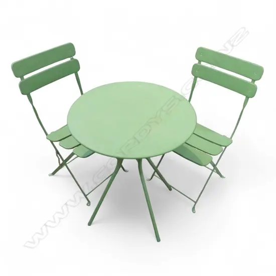 3 PCE GREEN METAL PATIO SET; TABLE & PR FOLDING CHAIRS