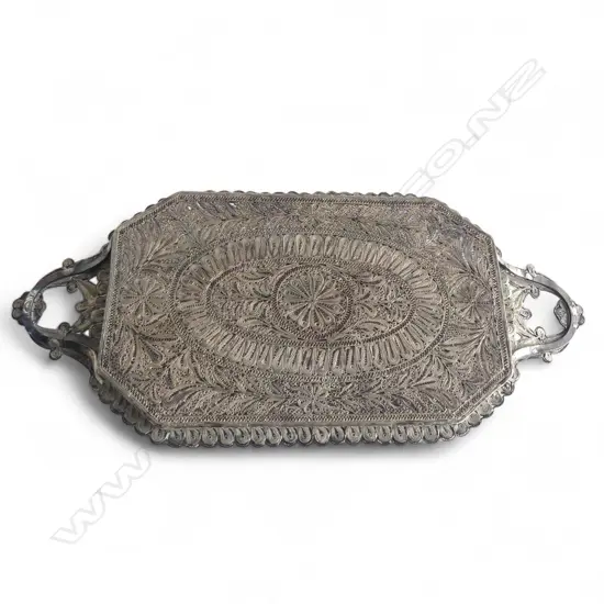 SILVER FILIGREE TRAY (TESTS BETWEEN 800-900) 320x150mm 376gms + SILVER METAL PARASOL HANDLE L.310mm