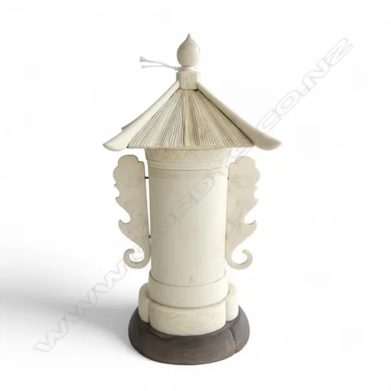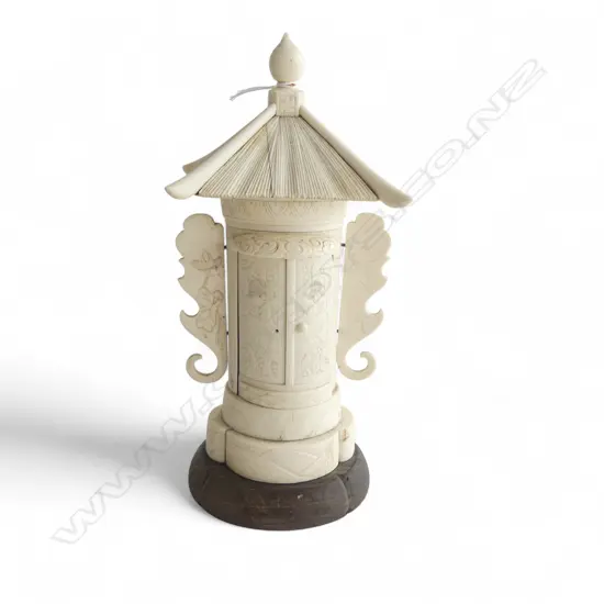 CARVED BONE JAPANESE SHRINE doors open to carved interior. One door w. fault. H.220mm