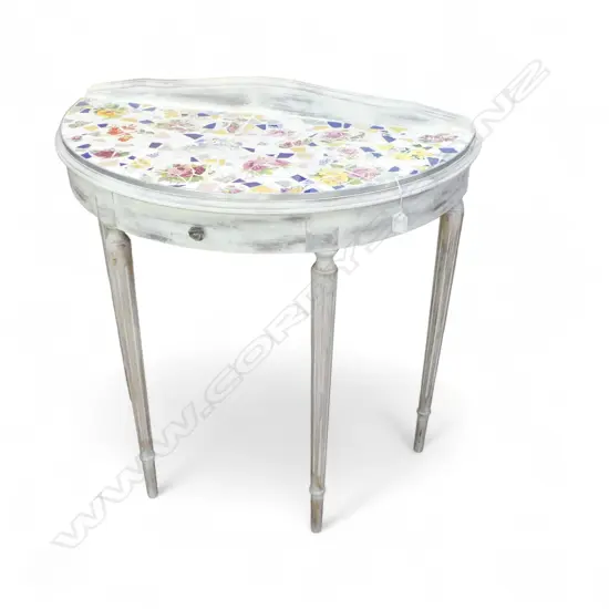 MOSAIC TOPPED HALF ROUND HALL TABLE white washed frame. W.810mm.