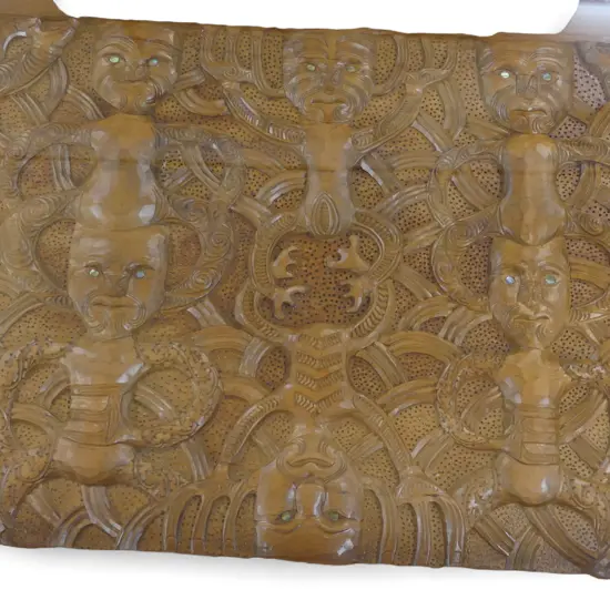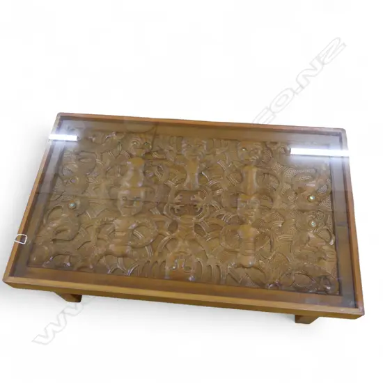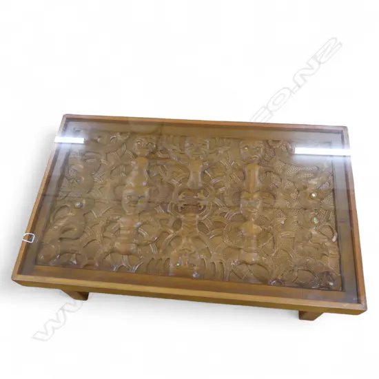 LARGE MAORI CARVEDTOPPED under glass COFFEE TABLE