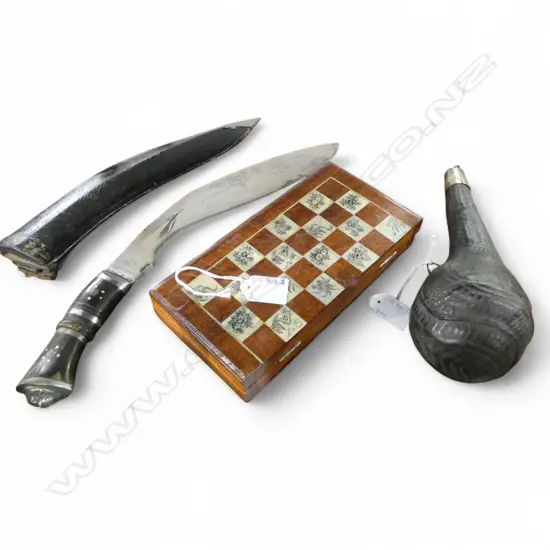 GURKHA KNIFE & SCABBARD L.415mm, LEATHER SHOT POUCH, WOODEN CHESS SET w. MoP INLAY W.220mm