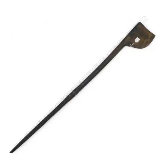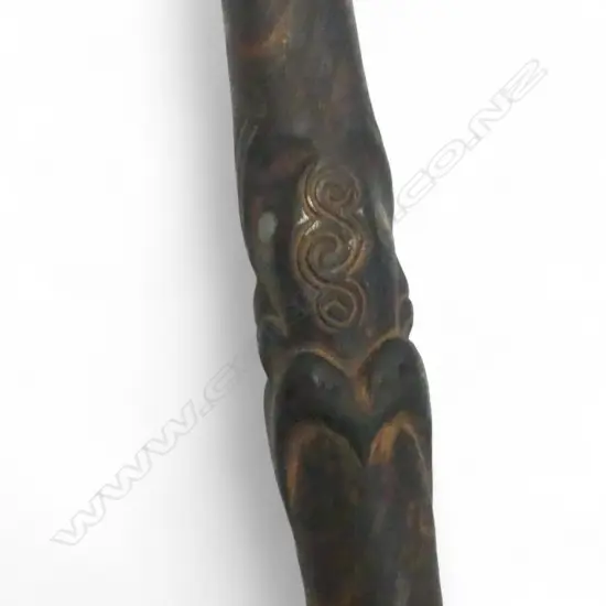 Mid / late 20thC MAORI TEWHATEWHA w PAUA INLAID AT TOP OF BLADE & CARVED HEAD TO SHAFT. L.1170mm. Of good weight