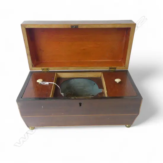 REGENCY SARCOPHAGUS SHAPED TEA CADDY, 2 LIDDED COMPARTMENTS, NO CENTRAL BOWL, L.300mm