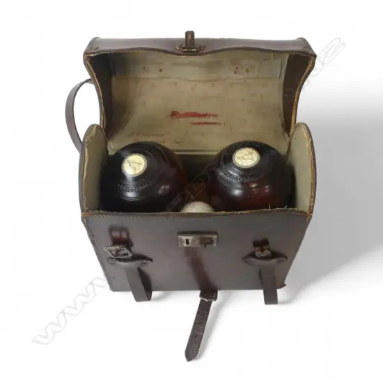 4 VINTAGE WOODEN LAWN BOWLS IN LEATHER CARRY CASE probably lignum vitae