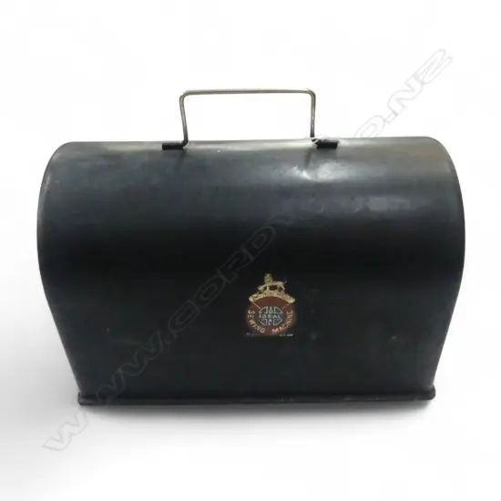 EARLY 20thC SMALL 'IDEAL SEWING MACHINE' chromed on oak base w black tin cover. Hand operated. L.255mm