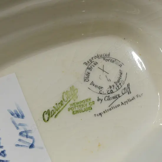 CLARICE CLIFF CENTREPIECE 'OLD BRITISH PORCELAIN' faulted W.410mm + GERMAN MANTEL VASE H.285mm