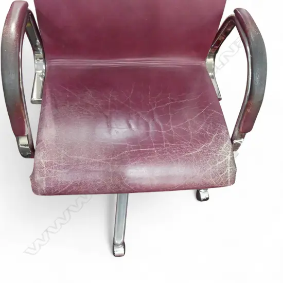 A WINCORP ADJUSTABLE OFFICE CHAIR WITH PURPLE LEATHER UPHOLSTERY (SEAT LEATHER CRACKED AND WORN)