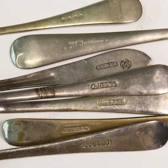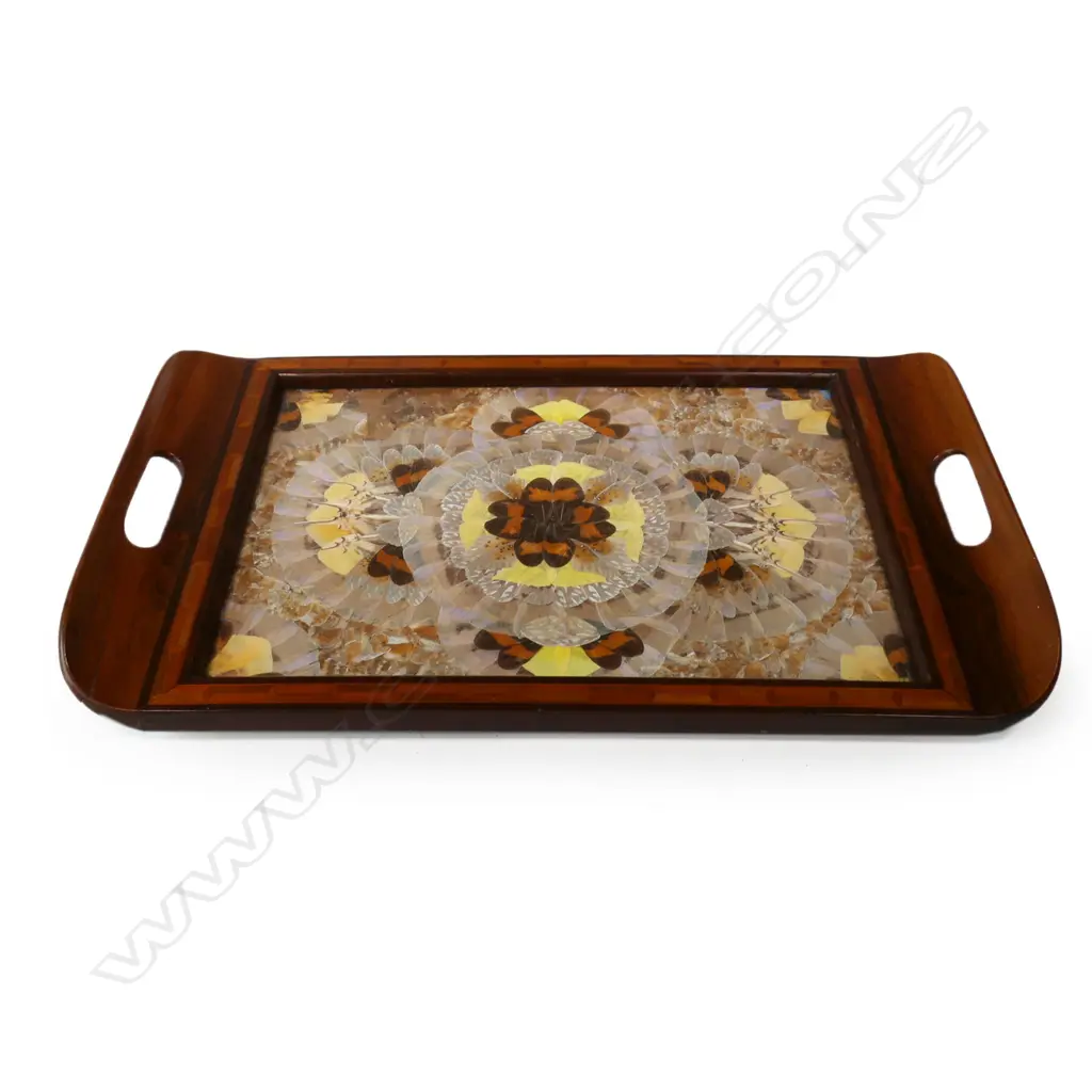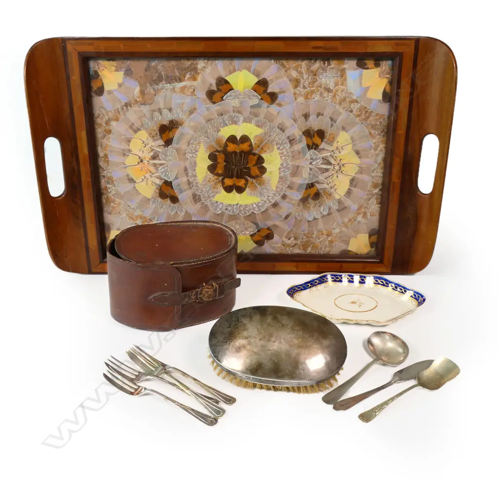 INLAID WOOD BUTTERFLY WING SERVING TRAY (prof repair to 1 handle), SILVER BRUSH (Total W.240gms), CUTLERY (1 silver) ETC