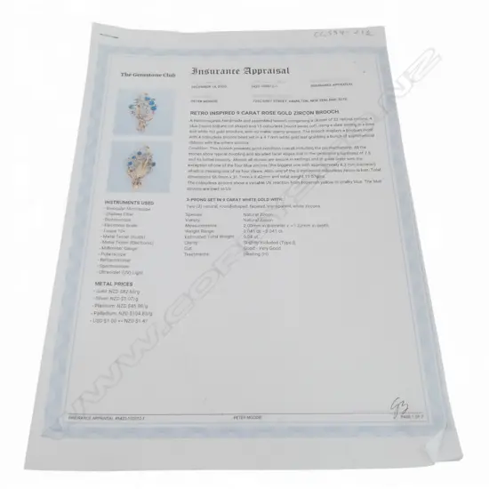 9CT GOLD BLUE AND WHITE ZIRCON BROOCH (one stone absent) with valuation