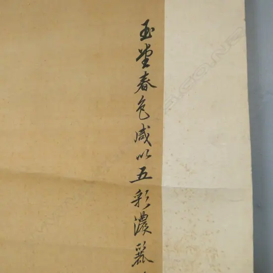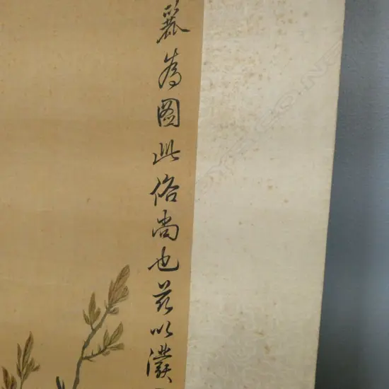 19C YUN YUAN JUN SCROLL INK & COLOUR PEONY SPRAYS SIGNED L165CM W83CM