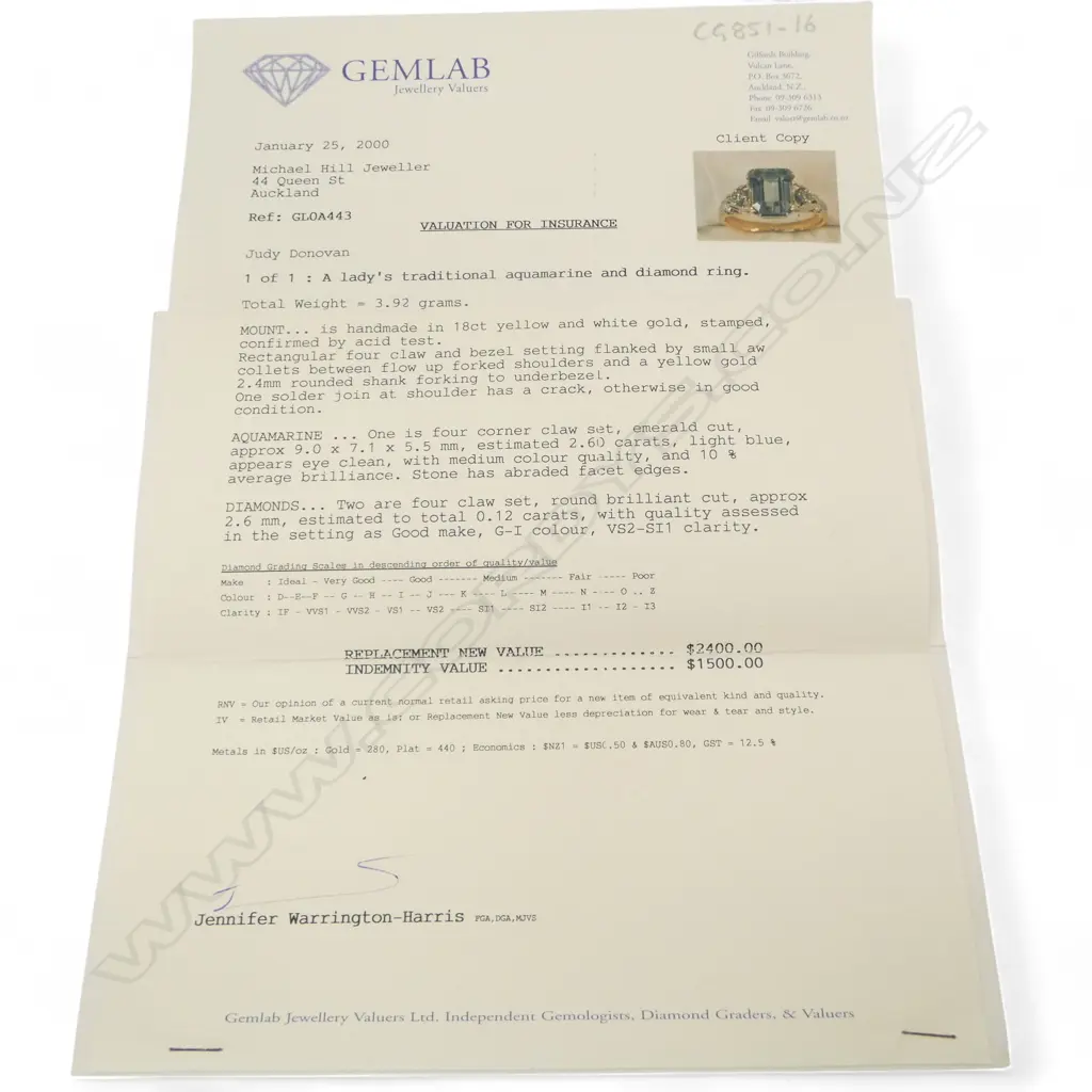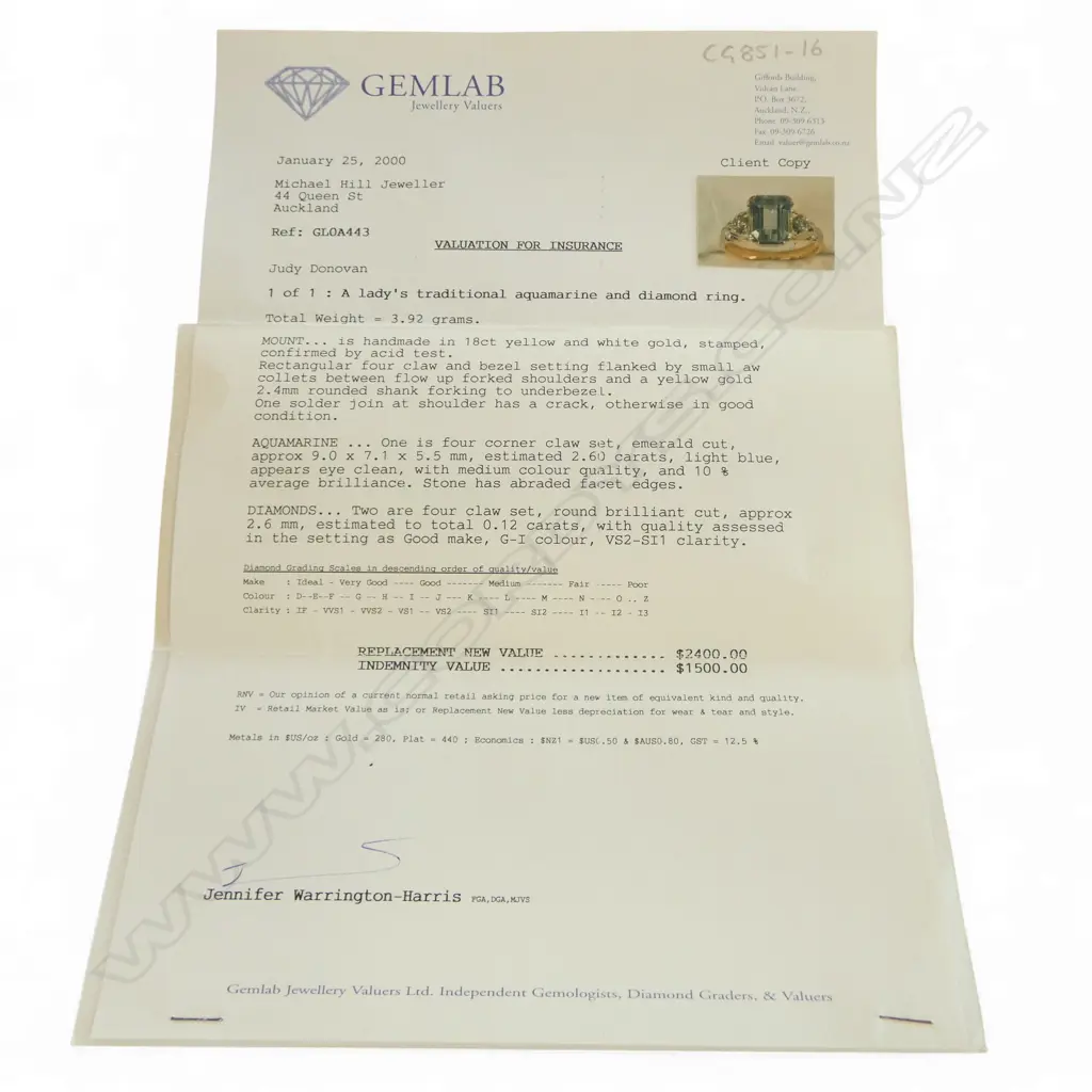 18ct 2 TONE GOLD, DIAMOND & approx. 2.60ct AQUAMARINE RING 3.92gms Valuation dated 2000, stone abraded SIZE L