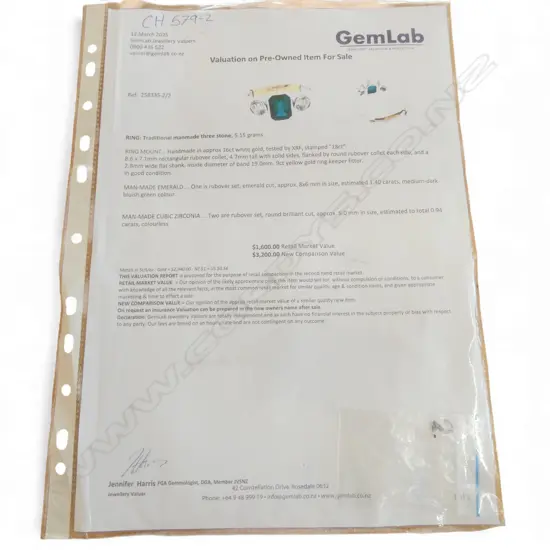 18ct GOLD 3 STONE MAN-MADE EMERALD & CUBIC ZIRCONIA RING with 9ct y/gold ring keeper 5.15gms SIZE R