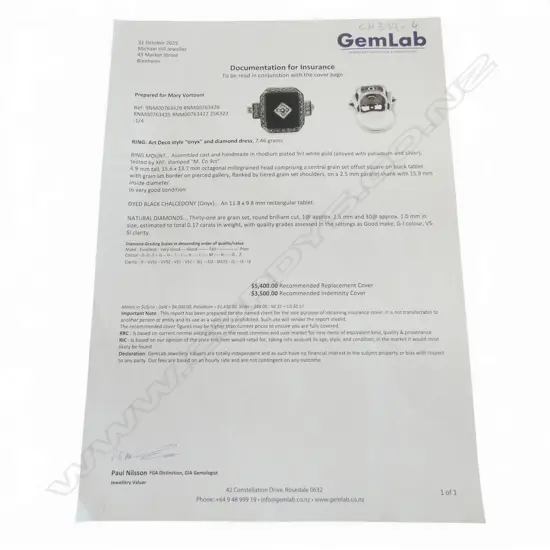 9CT WHITE GOLD DIAMOND & ONYX ART DECO STYLE RING (valuation) SIZE J1/2