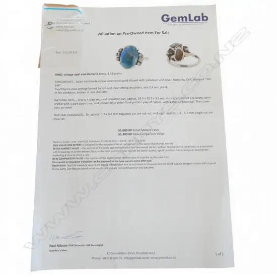 14ct W/GOLD, OPAL & DIAMOND DECO RING 4.34gms SIZE M1/2 (Shoulder of shank needs to be reattached to top)
