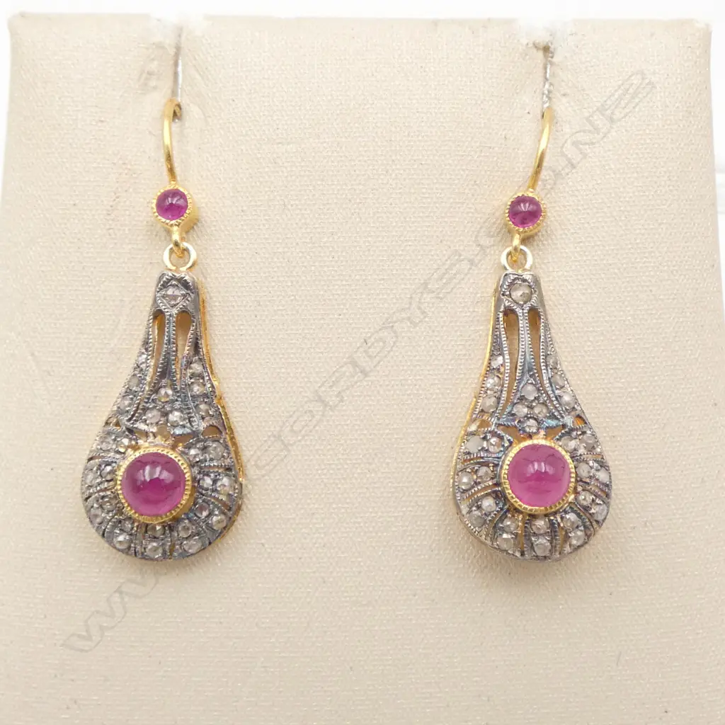 ANTIQUE STYLE PAIR OF SILVER GILT EARRINGS ROSE CUT DIAMONDS (0.80ct) RUBIES (0.60CT)