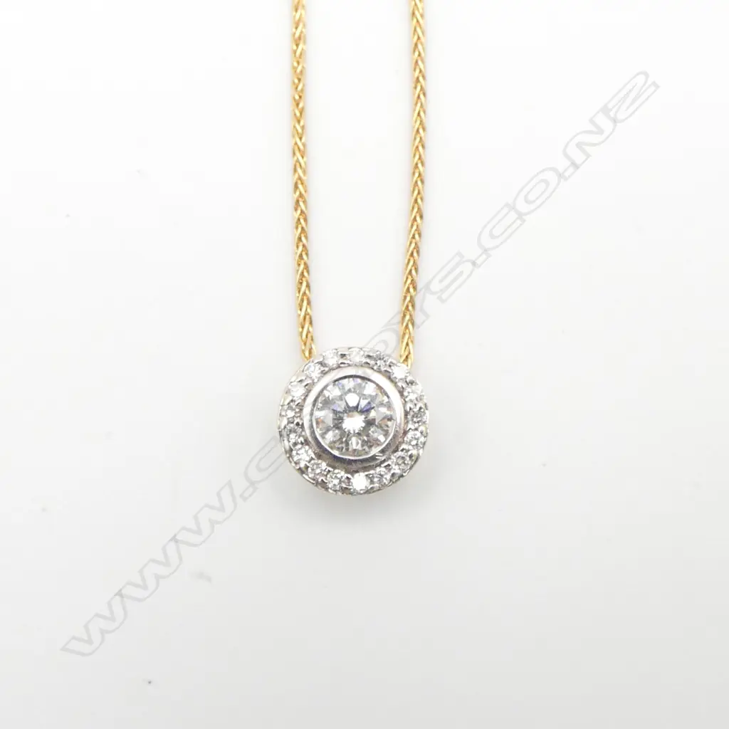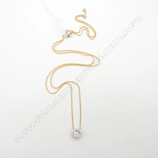 Designer 0.45ct DIAMOND SOLITAIRE PENDANT w diamond halo surround on 18ct GOLD CHAIN. Push button length adjust.8.2gms