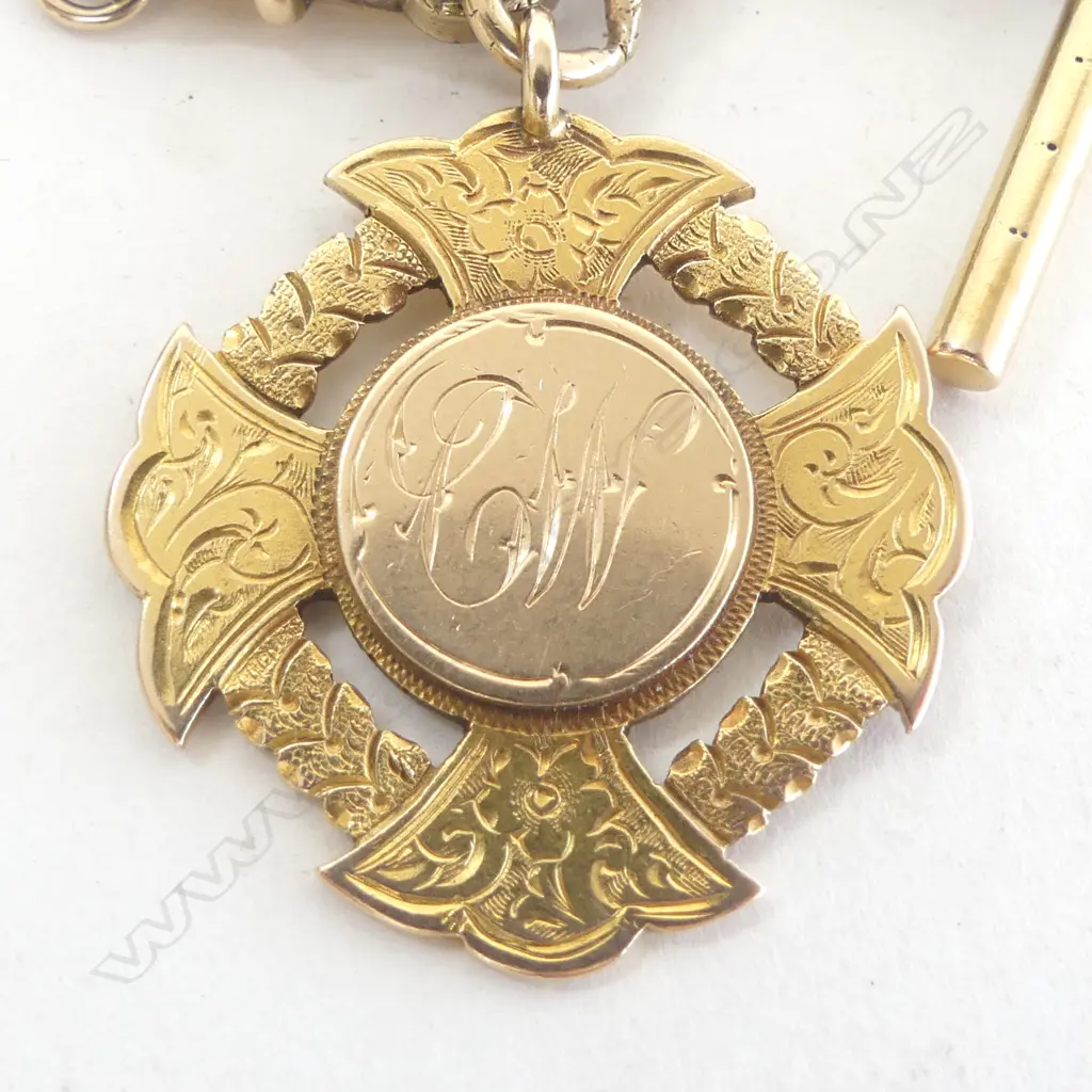 18CT GOLD FOB CHAIN (38gms) & 15CT GOLD FOB MEDAL (13gms)