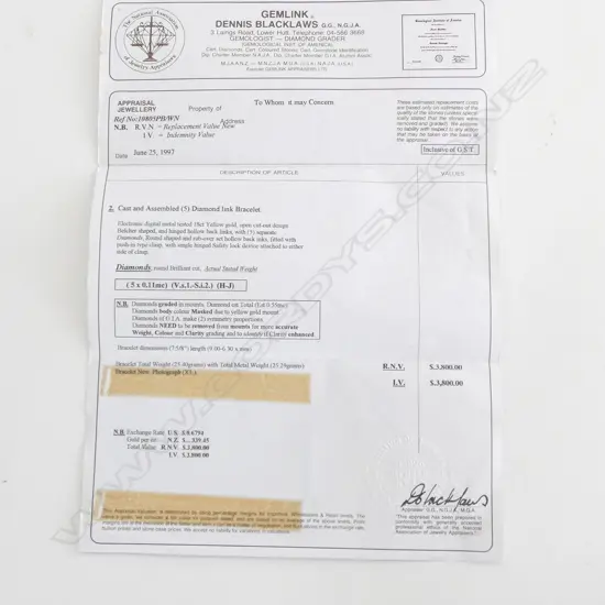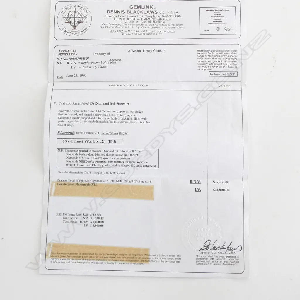 18ct Y/GOLD 5 DIAMOND BRACELET colour H/J clarity VS1 SI2. 20.8gms L.180mm VALUATION $3800.00 1997