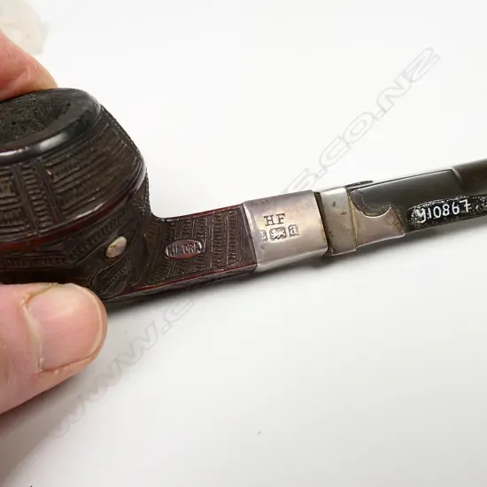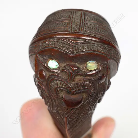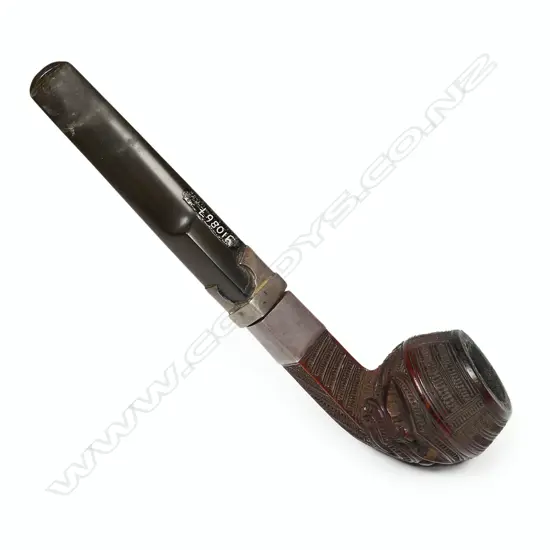 finely detailed with three stylised masks to the lower bowl, some paua disc eyes remain, lineal and notch carving above, conforming carving to the stem. With fitted silver screw mount, Birmingham 1900. Hard plastic mouthpiece. L.165mm. In original Morroco fitted case (hinges faulty) marked 'Kia-Ora' and with paper label detailing 'Carved by ‘Tene Waitere’ Rotorua’. Registered Y.10867.
