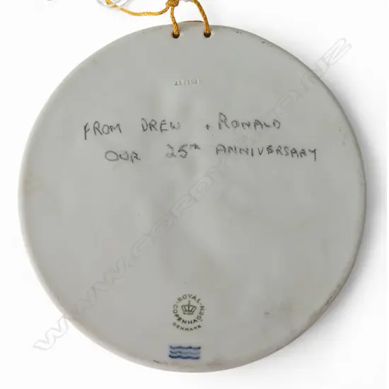 Royal Copenhagen stamp and personal note 'From Drew & Ronald on our 25th Anniversary' to reverse.