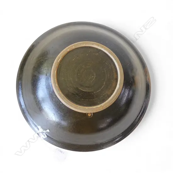 Graeme Storm large bowl - wax resist green glaze patterned decoration on iron glaze ground. Impressed potter's mark. Dia.375mm.